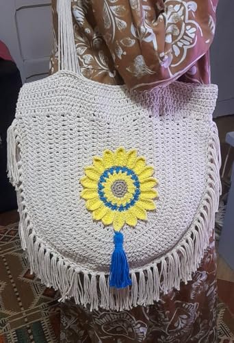 Generic - حقيبة كروشيه يدوية مع زهرة عباد الشمس وشراشيب، بيج مع أصفر وأزرق