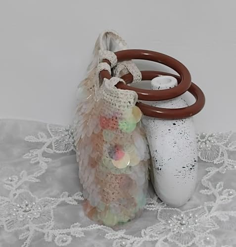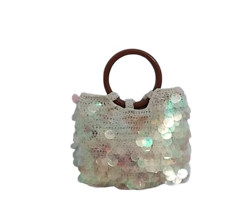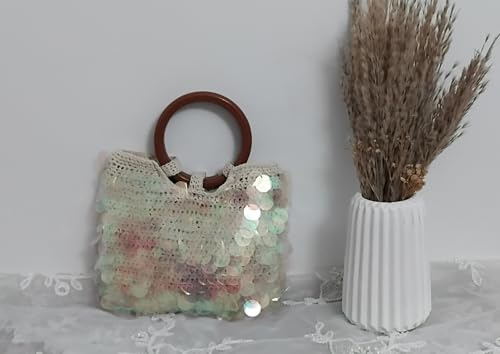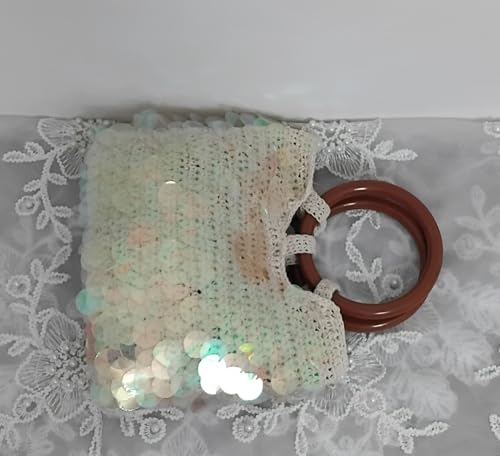 Generic - شنطة سهرة كروشيه يدوية الصنع، تصميم قوس قزح مطرز، مقبض بني، تفاصيل دانتيل
