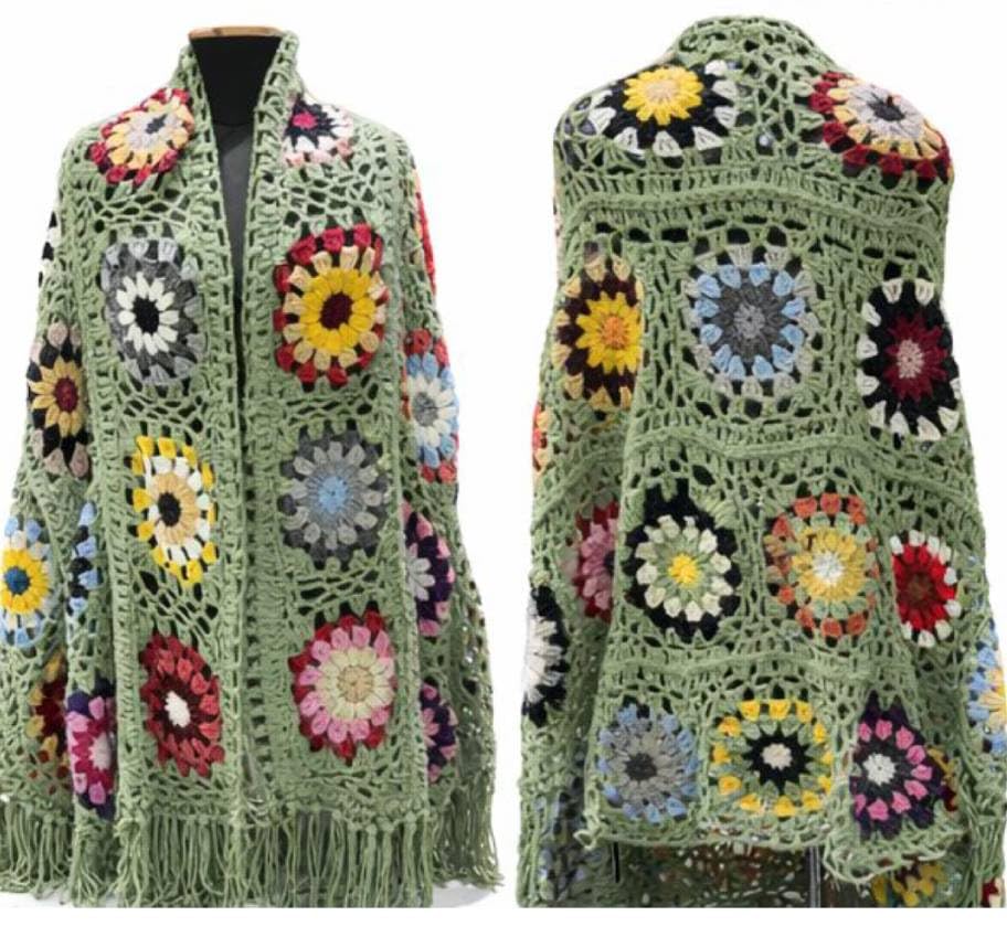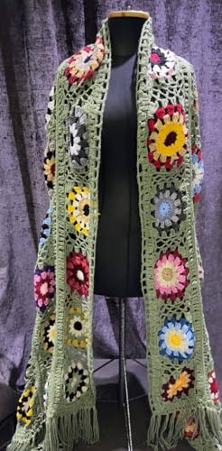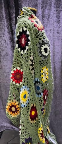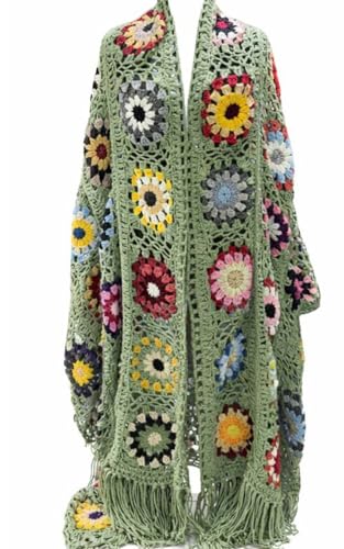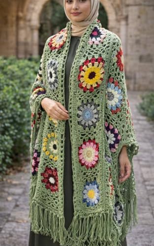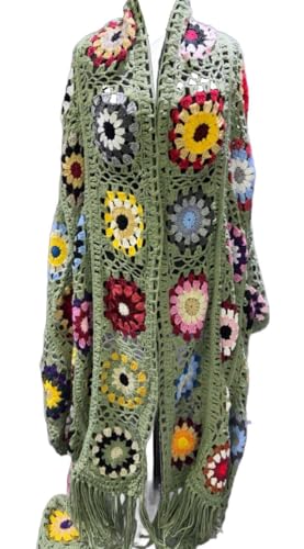 Generic - شال كروشيه مصنوع يدوياً بنمط الجراني سكوير، أخضر مع زهور ملونة، بشراشيب