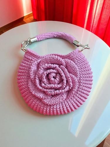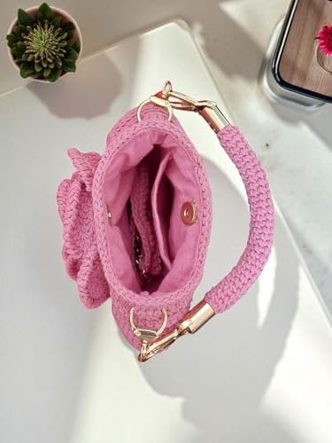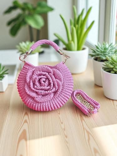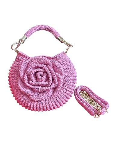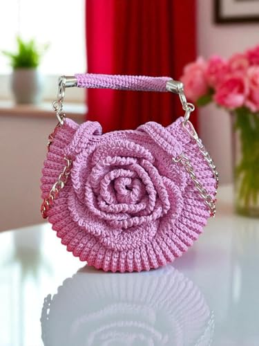 Generic - شنطة يد كروشيه مصنوعة يدويًا مع حزام سلسلة معدني، لون وردي، مقاس 21 × 18 سم
