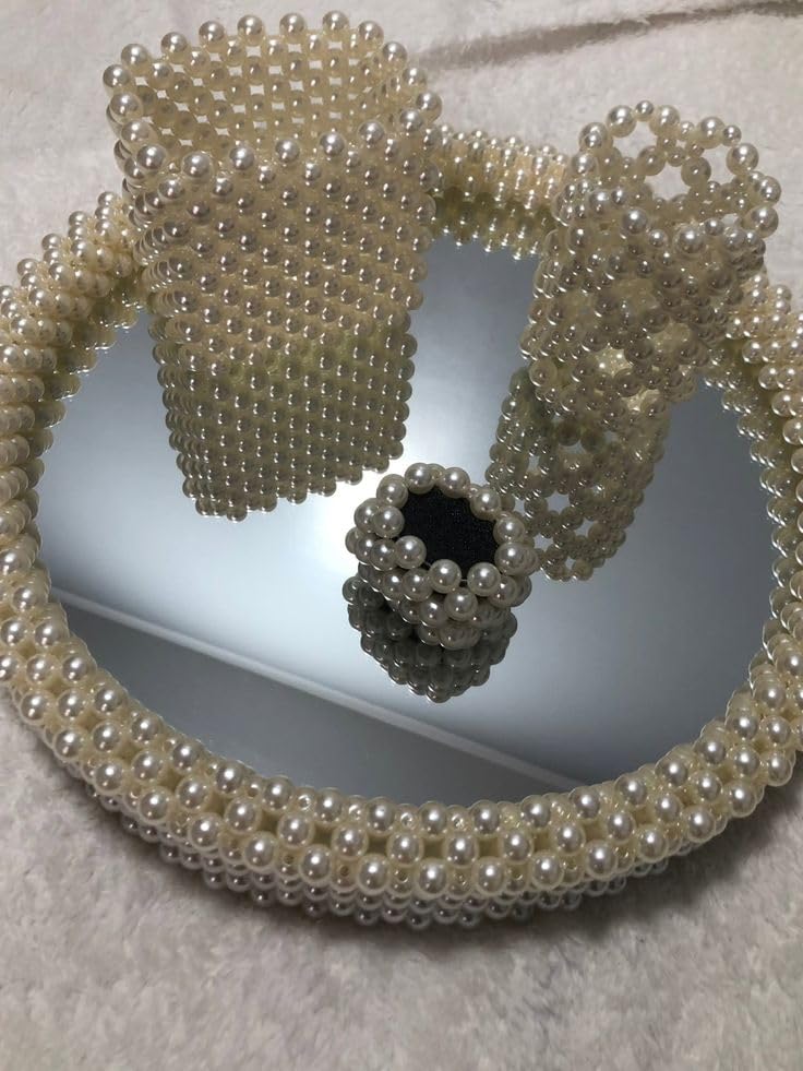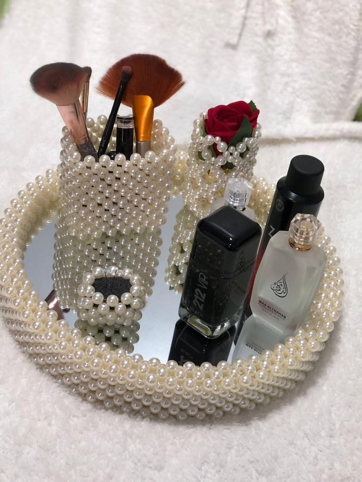 Generic - مجموعة من صينية تنظيم ومنظم للفرش من اللؤلؤ الصناعي المصنوع يدوياً، تصميم مميز، لتنظيم المكياج والعطور، أبيض لؤلؤي، 25 سم