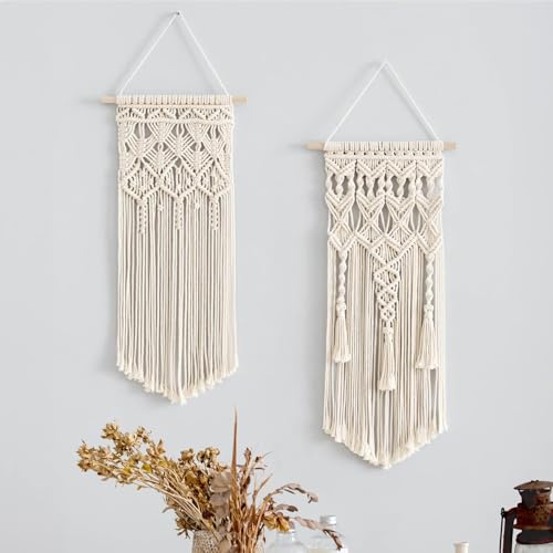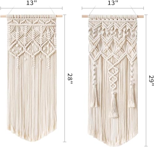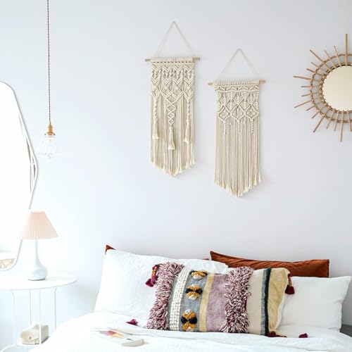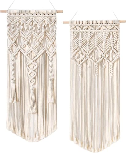 Generic - مكرمية من حبل قطني وقضيب خشبي بنمط بوهو مصنوعة يدويًا للتعليق على الحائط لوحة فنية لغرفة المعيشة وغرفة النوم، قطعتين، كريمي