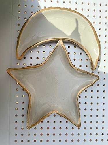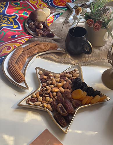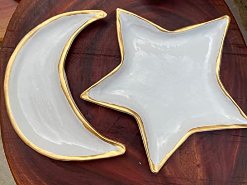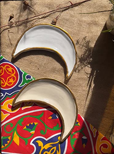 Generic - طبق تقديم فخار مصنوع يدويا بتصميم هلال ونجمة بيضاء مع حواف ذهبية من بوتري مادنس