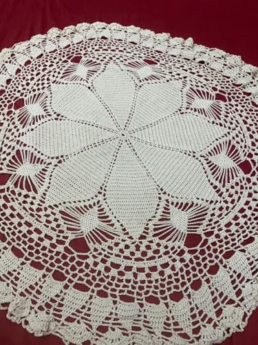 - تصميم كروشيه يدوي فاخر: مفرش طاولة دائري مصنوع بالكامل يدوياً بتقنية الكروشيه التقليدية، يتميز بزخارف هندسية دائرية معقدة ونقوش زهرية متداخلة تضفي أناقة كلاسيكية استثنائية
