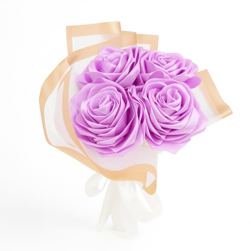 - تصميم يدوي: باقة ورد مصنوعة يدوياً من قماش الساتان الفاخر مع ٤ وردات جميلة بلون أرجواني ناعم
