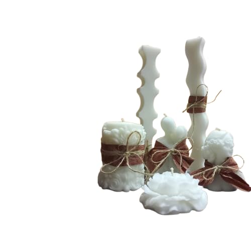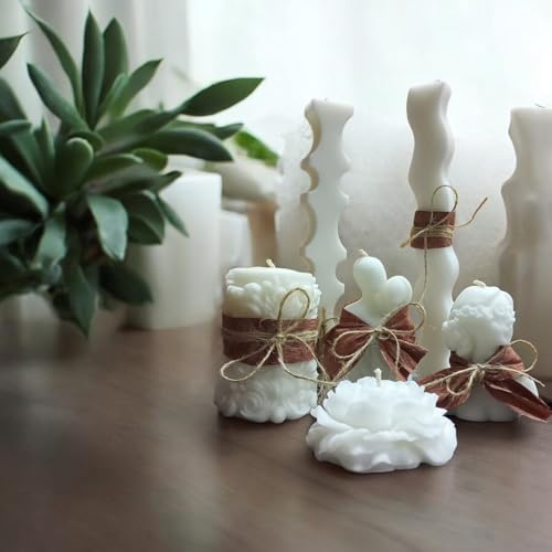 Generic - مجموعة شموع ديكورية بيضاء مصنوعة يدوياً، شموع منحوتة بأشكال متنوعة مع زخارف الورود والقلوب، مزينة بأشرطة بنية وخيوط جوت، هدايا رومانسية