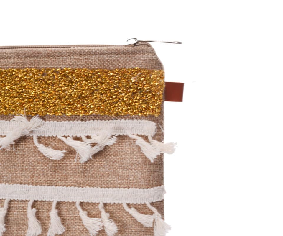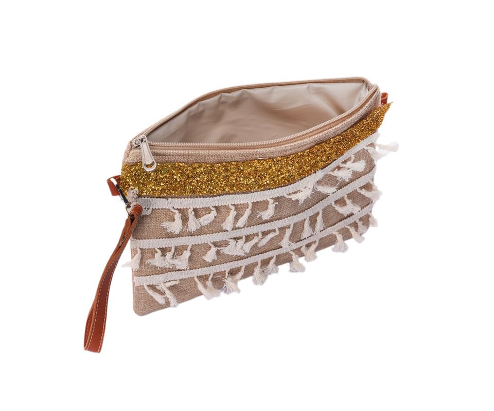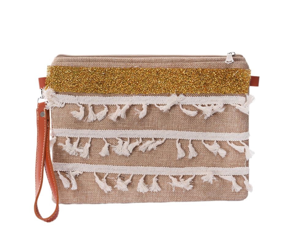 Nubia Egypt - شنطة يد صغيرة مبطنة مصنوعة يدويا من الكتان بسوستة مع تطريز مرصع باحجار الراين الذهبية للنساء - بيج