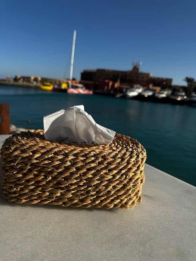 - تصميم مصنوع يدويًا: غطاء علبة مناديل جميل منسوج يدويًا من الأعشاب البحرية بملمس ريفي طبيعي، مثالي لإضافة لمسة حرفية إلى أي غرفة
