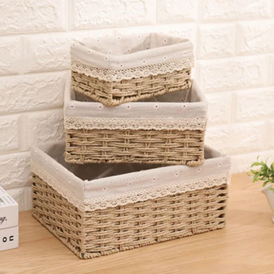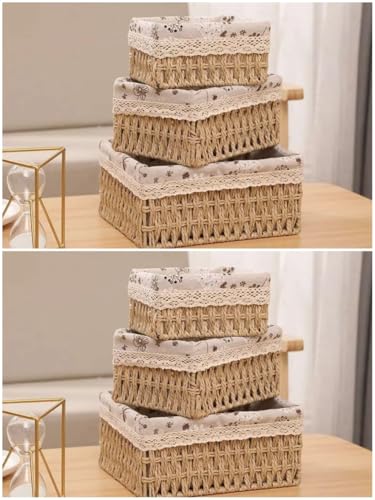 Generic - مجموعة سلال منسوجة يدويا من الراتان مكونة من 3 قطع - سلال تخزين مزخرفة ببطانة قماشية وحواف من الدانتيل | منظم صديق للبيئة للغسيل والحمام وغرفة النوم وديكور غرفة المعيشة (مجموعتان (6 قطع))