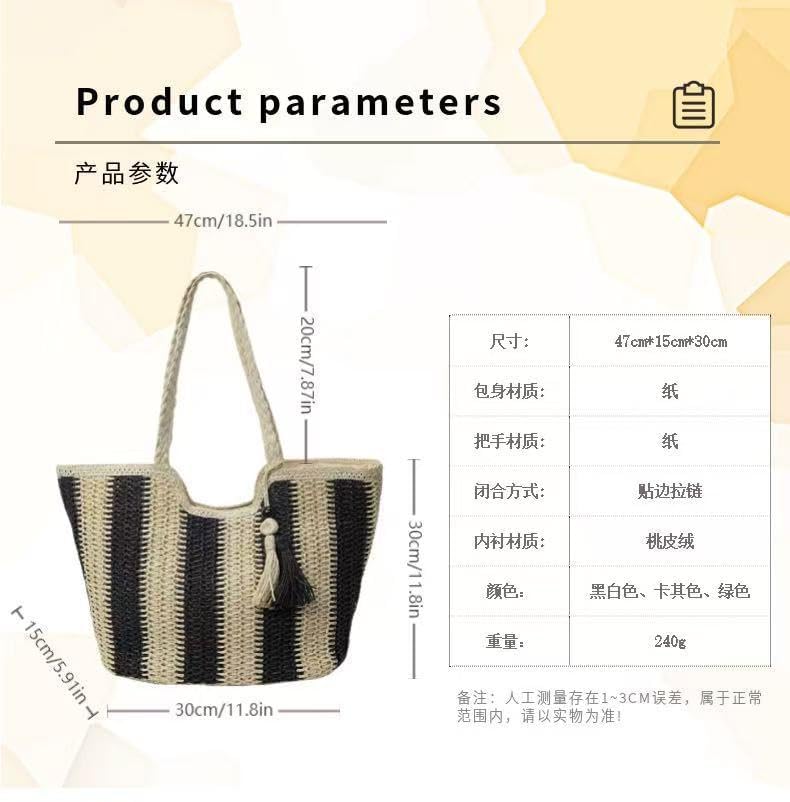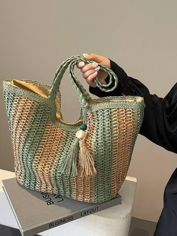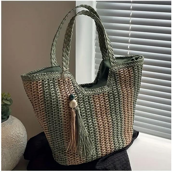 Generic - شنطة توت للشاطئ منسوجة يدويا من القش مع شرابة، نمط مخطط، مقبض مضفر، متوفرة باللون الطبيعي