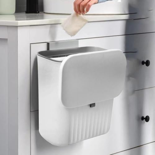 Generic - سلة مهملات معلقة بخطاف لدواليب المطبخ أو الحمام أو المكتب، سلة مزودة بغطاء متأرجح وتصميمها مدمج وموفر للمساحة، سلة المهملات هذه سهلة التنظيف وتثبت بلاصق وتصميمها لا يسبب حدوث مشاكل وعيوب على الجدران
