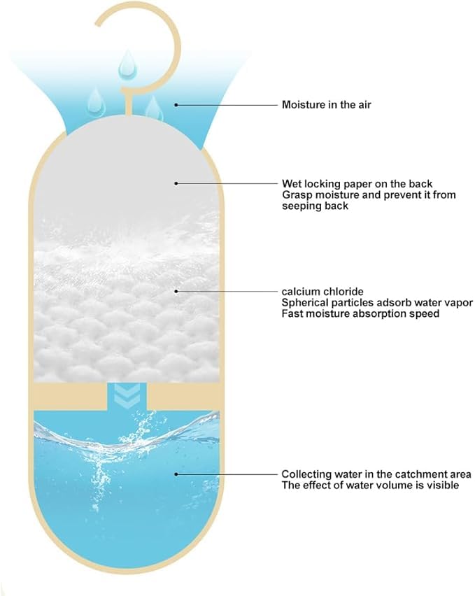 - انتعاش يدوم طويلاً يمكن أن يدوم ممتص الرطوبة المعلق لمدة تصل إلى 60 يومًا، اعتمادًا على درجة الحرارة والرطوبة. قد تستغرق عملية إزالة الرطوبة الجسدية بعض الوقت، لذا يرجى التحلي بالصبر.