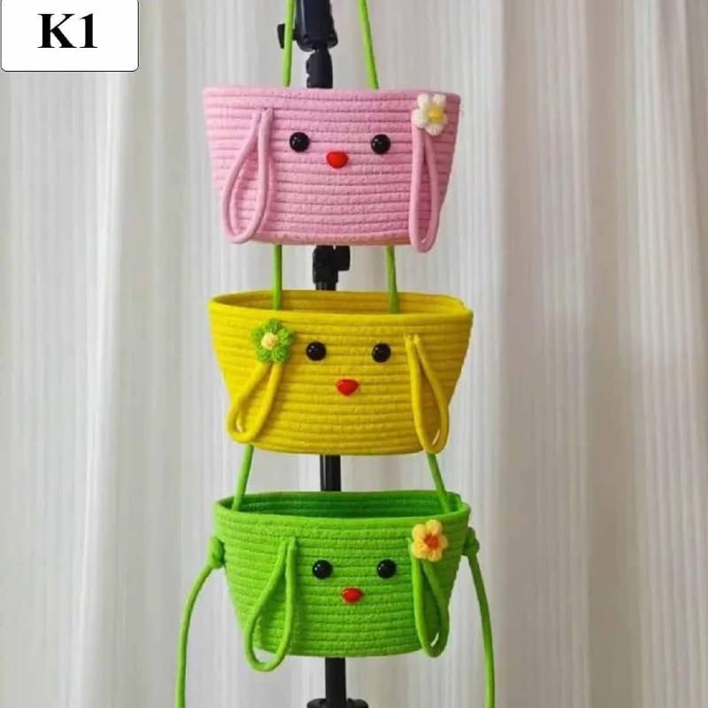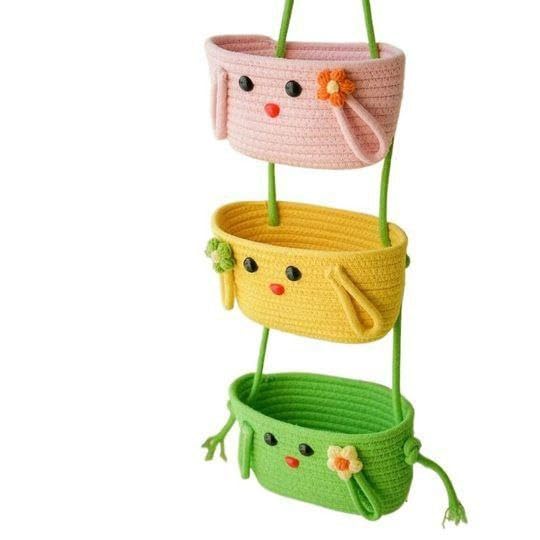 - تصميم مزخرف: حل تخزين معلق ثلاثي الطبقات يتميز بسلال ساحرة بألوان وردي وأصفر وأخضر مع تعبيرات وجه رائعة ولمسات من الزهور.