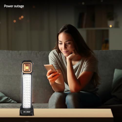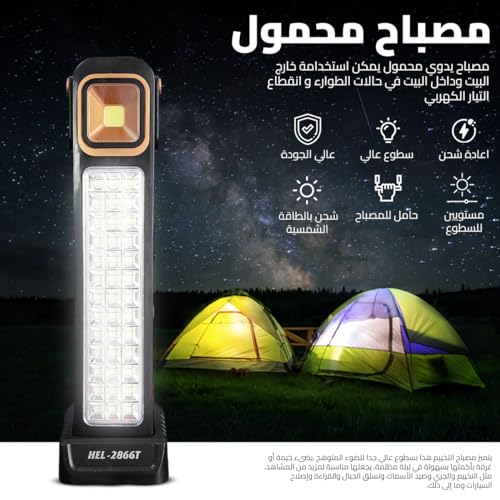 H-Home - مصباح طوارئ LED قابل لإعادة الشحن 30 وات بتقنية ذكية من هانسو، 5 تروس، مقبض دوار 320 درجة، عمر طويل- شحن بالطاقة الشمسية بسعة بطارية 2400 ميلي امبير في الساعة، موديل HEL-2866T (أسود)