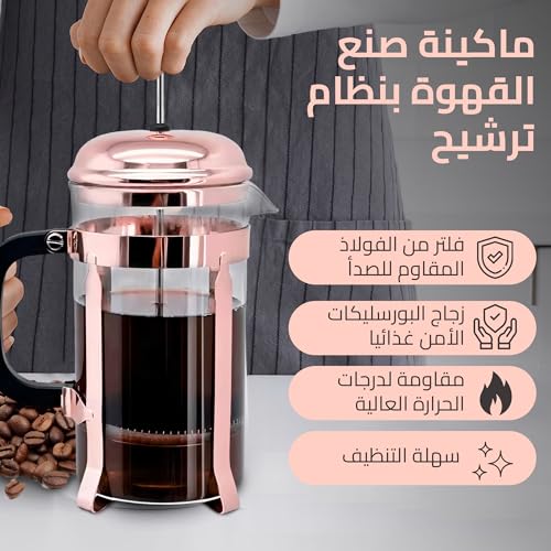 - استمتع بمذاق القهوة الأصلية: استمتع بالنكهة والرائحة الغنية للقهوة الطازجة مع مكبس تحضير القهوة الفرنسية فرينش بريس الخاص بنا، المصمم لاستخراج الإمكانات الكاملة لحبوب القهوة المطحونة المفضلة لديك.