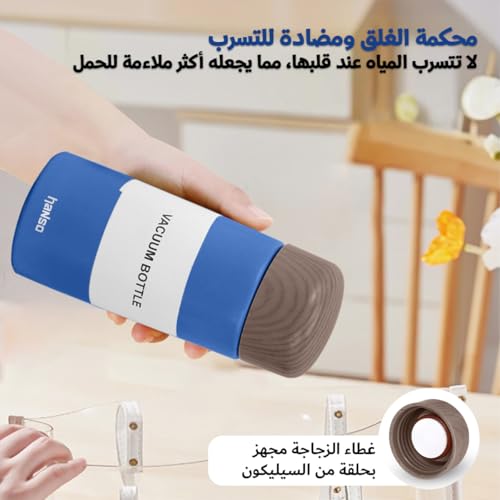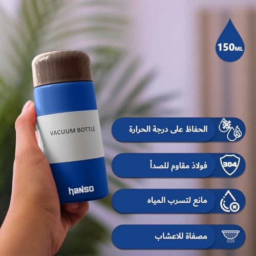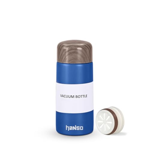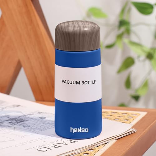 Hanso 1 - زجاجة مياه، زجاجة مياه صغيرة معزولة بتفريغ الهواء 150 مل، كوب ترموس رفيع من الفولاذ المقاوم للصدأ، ترموس جيب خشبي حبيبي، كوب محمول مبتكر للاستخدام الخارجي (أزرق)