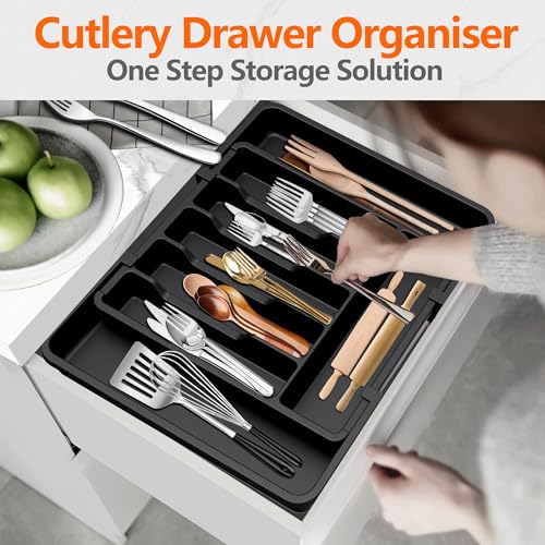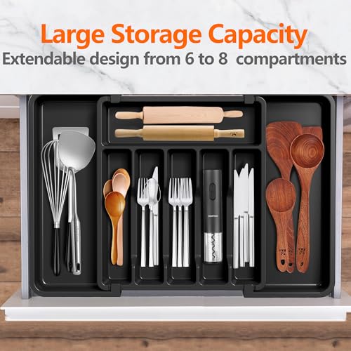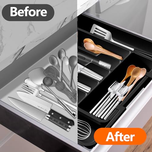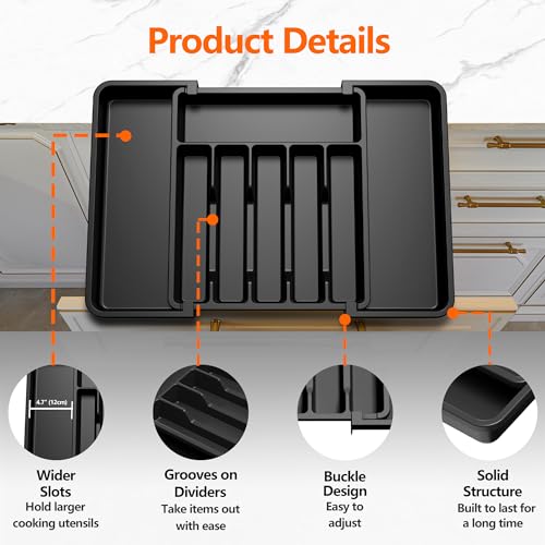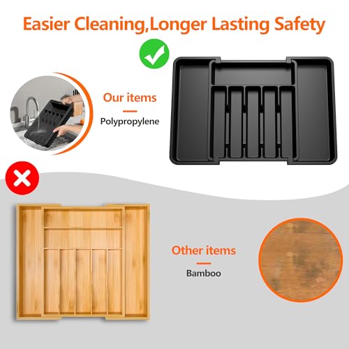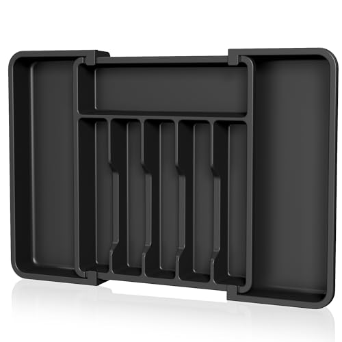 HanZhiQiang - منظم ادراج ادوات المائدة، صينية ادوات مائدة قابلة للتوسيع للمطبخ، حامل ادوات مائدة فضية قابل للتعديل، تخزين بلاستيكي صغير الحجم للملاعق والشوك والسكاكين (اسود)