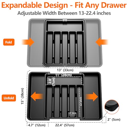 - 【مقاس قابل للتعديل】مع عرض قابل للتعديل بين 33-57 سم، فهو متوافق مع أحجام الأدراج المختلفة. عند توسيعها بالكامل، تكون أبعاد صينية أدوات المائدة 57 × 38 × 5 سم وعند طيها بالكامل، فإنها تقل إلى 33 × 38 × 5 سم. لذا بغض النظر عن حجم أدراج المطبخ، فإن منظم أدراج المطبخ هذا سيكون مناسبًا بالتأكيد.