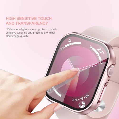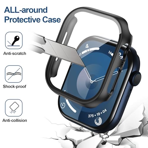 - [تصميم واقي 2 في 1]: جراب صلب مقاوم للحرارة مع شاشة حماية مدمجة شفافة من زجاج مقوى فائق النحافة (لا تسبب أي مشكلة في اللمس)، يغطي كلاً من الشاشة والحواف، ويحمي ساعة آبل 360 درجة من الخدوش والصدمات والسقوط العرضي.