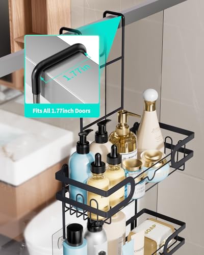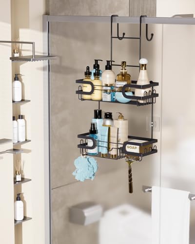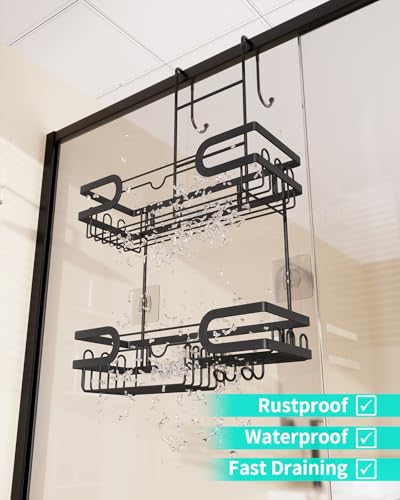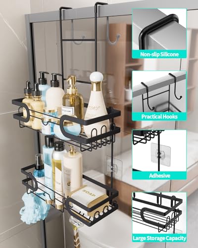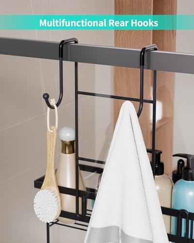 HapiRm - هابيريم علبة دش معلقة مع 14 خطاف وحامل صابون بدون ثقب فوق الباب منظم معلق من الستانلس ستيل المقاوم للصدأ والماء للحمام - اسود