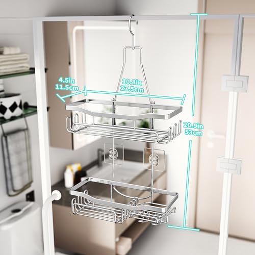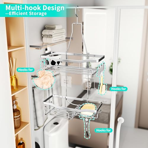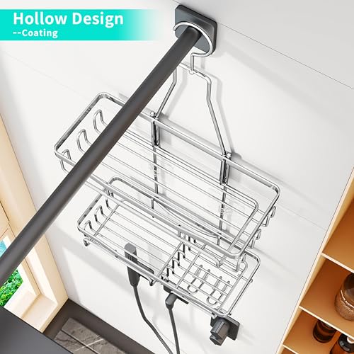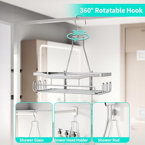 - [تصميم متعدد الوظائف]: يمكن استخدام الخطاف الدوار 360 درجة على الباب الزجاجي وقضيب الدش في الحمام. سوف تحصل على رفين للاستحمام بدون حفر بخطافات متعددة وحامل صابون