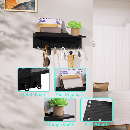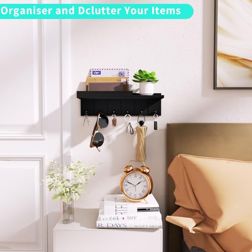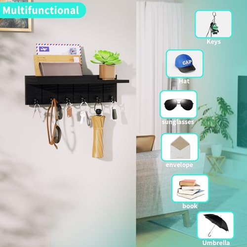 HapiRm - هابيريم حامل مفاتيح للحائط - خطافات مفاتيح خشبية مثبتة على الحائط مع 6 خطافات، رف مفاتيح مع رف تخزين للبريد والهاتف وديكور صغير، مثالي للمدخل والمكتب والرواق