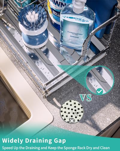 - 【سريع الجفاف وخالي من الروائح】يتميز منظم حوض المطبخ الخاص بنا بنظام تصريف أفقي يزيد من مساحة التصريف لإزالة المياه بشكل أسرع. يعزز التصميم المفتوح السفلي لرف الحوض تدفق الهواء، ويسرع أوقات التجفيف ويمنع الروائح الكريهة من العالق. حافظ على رائحة مطبخك منعشة وأدوات التنظيف جافة مع حل تخزين الحوض الفعال الخاص بنا.