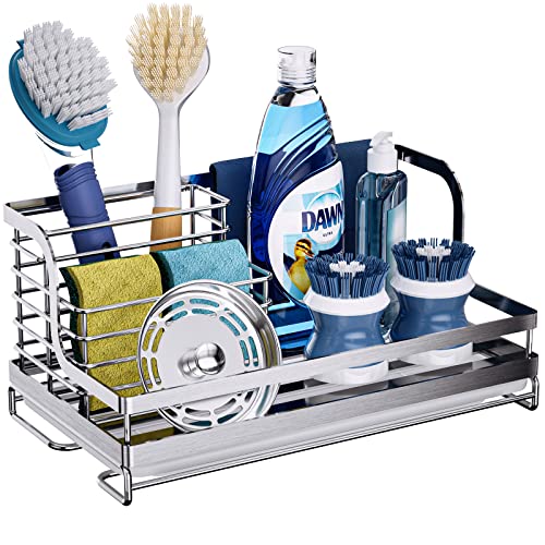 HapiRm - هابيريم علبة حوض المطبخ - حامل اسفنجي 5 في 1 لحوض مع صينية تصريف قابلة للازالة لسطح الطاولة اسفنجة من الستانلس ستيل المقاوم للصدا - منظم لملحقات الفرشاة والحوض فضي