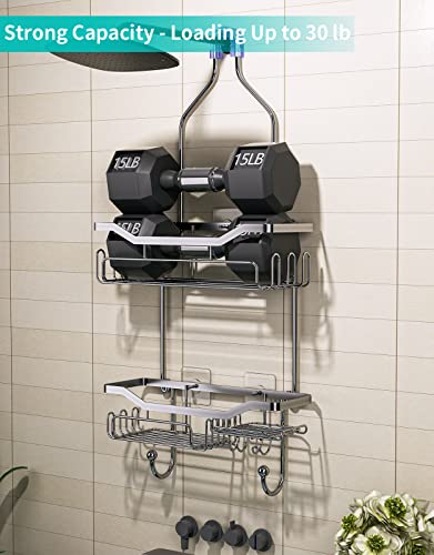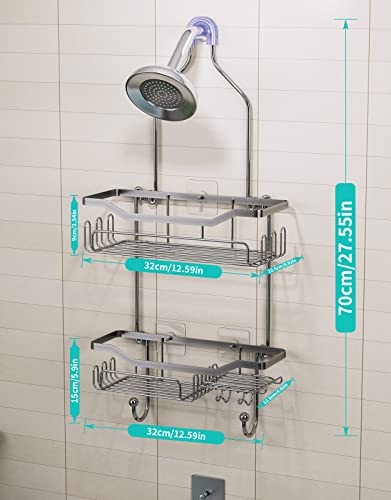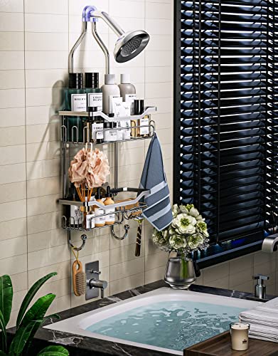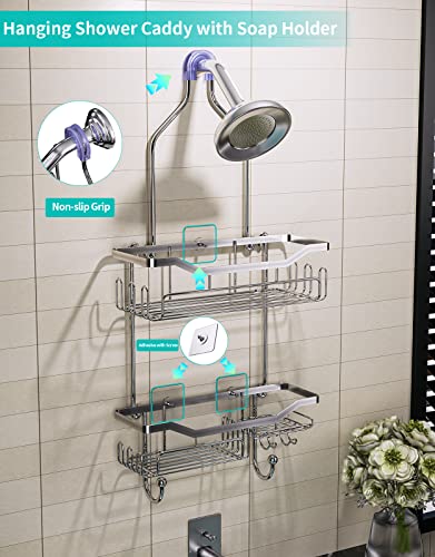 HapiRm - علبة دش معلقة منظم معلق فوق رأس الدش صغير مقاوم للصدأ مع خطافين فضي