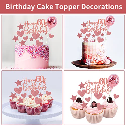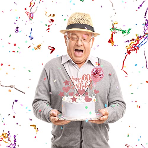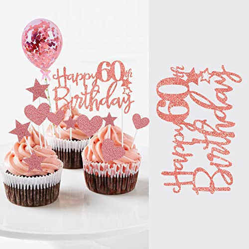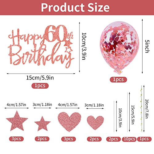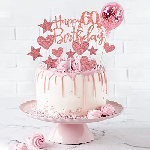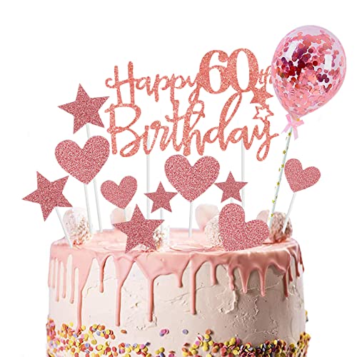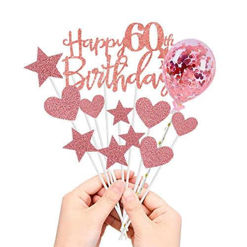 onehous - زينة كعكة عيد الميلاد الستين بعبارة Happy 60th Birthday بلون ذهبي وردي، مجموعة زينة كعكة عيد الميلاد الستين، زينة كعكة عيد الميلاد الستين مع بالون على شكل قلب ونجمة لامعة لتزيين الكب كيك للنساء