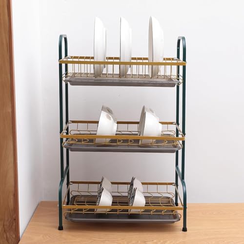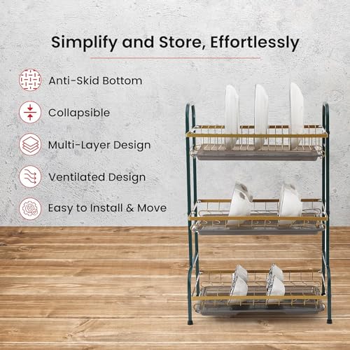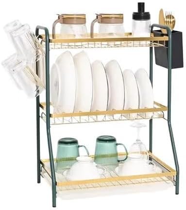Generic - رف تجفيف الاطباق مكون من 3 طبقات من هابي هوم | رف تخزين لطاولة المطبخ | حامل لوح التصريف ولوح التقطيع | سلة ادوات فاخرة (اخضر داكن وذهبي)