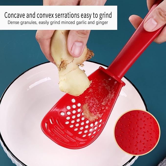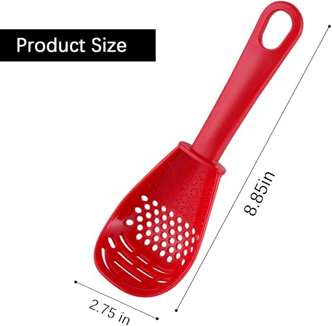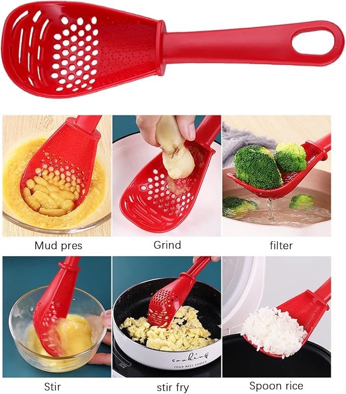 Happy Home - معلقة للطهي متعددة الاستعمالات 6 في 1 من هابي هوم، أدوات مطبخ مقاومة للحرارة مناسبة كمعلقة طهي بفتحات ومصفاة وهراسة وبشارة ثوم لتصفية المكونات، أحمر