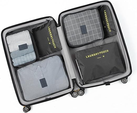 Happy Home - شنط ضغط قماش مكعبة متعددة الوظائف ومضادة للماء بنمط شبكي مع أكياس غسيل لتنظيم شنط السفر والغسيل وتخزين الملابس من هابي هوم، عبوة من 6 قطع، (لون أسود)