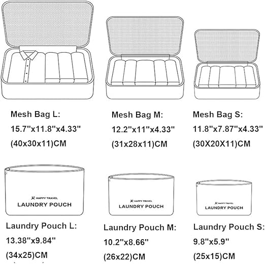- 【شنطة بأحجام مختلفة】3 مكعبات شبكية (مقاس L: 40 × 30 × 11 سم، مقاس M: 30 × 28 × 11 سم، مقاس S: 30 × 20 × 11 سم، 3 أكياس غسيل (مقاس L: 34 سم × 25 سم، M: 26 سم × 22 سم، مقاس S: 25 سم × 15 سم)