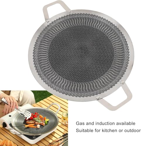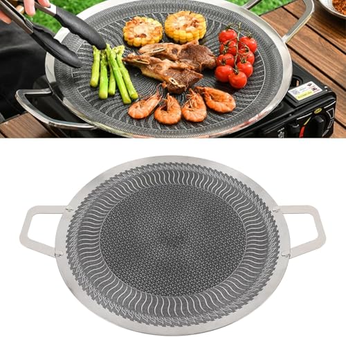 Generic - طاسة شواء دائرية من فولاذ مقاوم للصدأ غير لاصقة مزودة بمقبضين لمواقد الحث في الأماكن الخارجية والتخييم وشواء اللحوم والسجق والبيض والمأكولات البحرية من هابي هو، مقاس 38 سم، صنع في كوريا