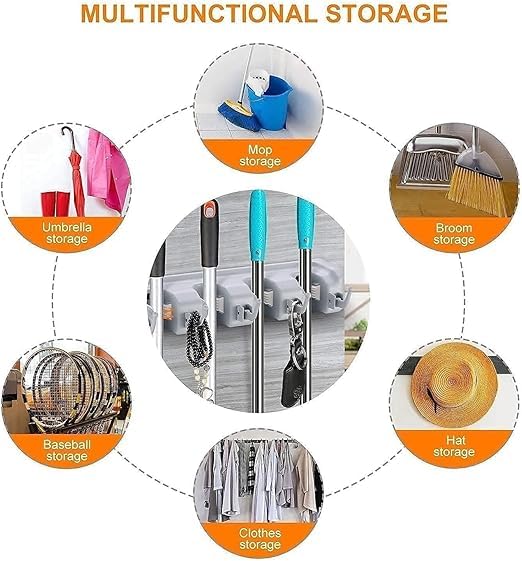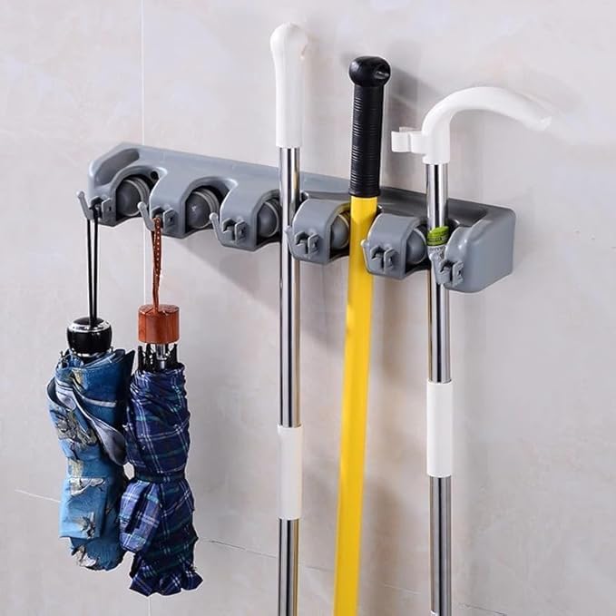Happy Home - منظم لتعليق المكانس والفرش والمساحات مكون من 5 فتحات و6 شماعات من هابي هوم، منظم يثبت على الحائط للممسحة والمكنسة، شماعة للمطبخ والحديقة والجراج وتعليق الأدوات