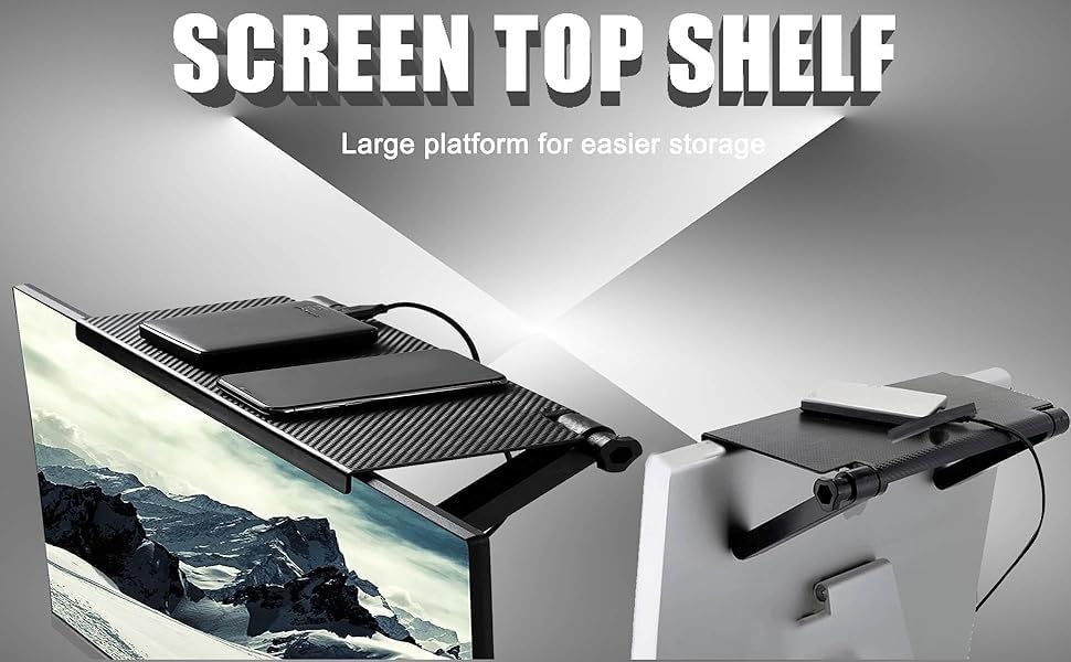 - حامل متعدد الوظائف: يمكن تركيب الرف العلوي للشاشة على الجزء العلوي من شاشة الكمبيوتر، وأعلى التلفزيون، ثم وضع بعض الأشياء عليه، ويمكن استخدامه أيضًا كحامل للهاتف الخلوي، وحامل آيباد، وضبط الزاوية اليمنى إلى وضع مريح لمتابعة العرض