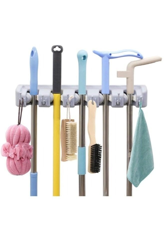 Generic - منظم حامل المكنسة والممسحة يثبت على الحائط من هابي هوم | رف ادوات تنظيف من 5 فتحات مع خطافات للتخزين في المنزل والمرآب