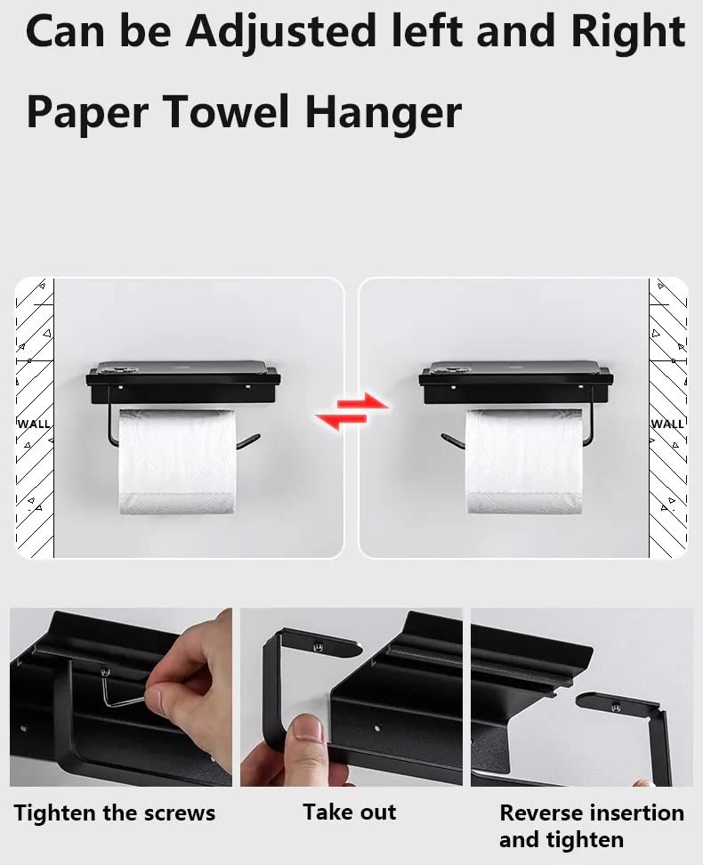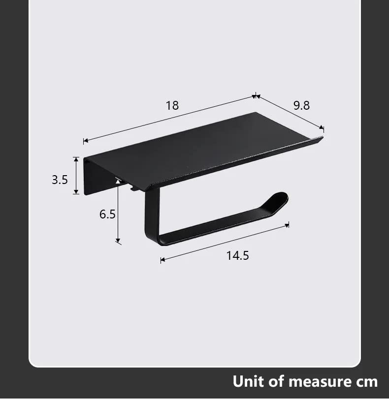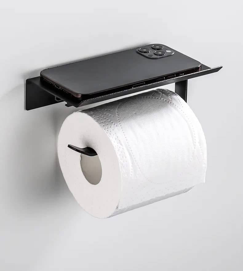Harrington Marley - حامل ورق تواليت اسود مع رف | حامل ورق تواليت ستيل اسود | رف تخزين المناديل المبللة | بكرة مناديل قوية مثبتة على الحائط مع رف حامل جوال، تصميم عصري ونظيف