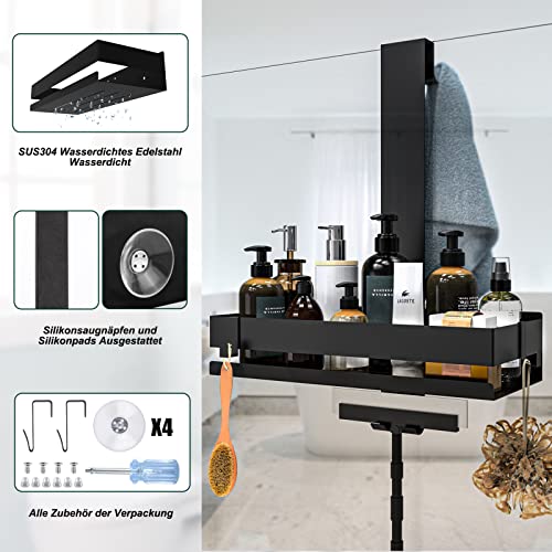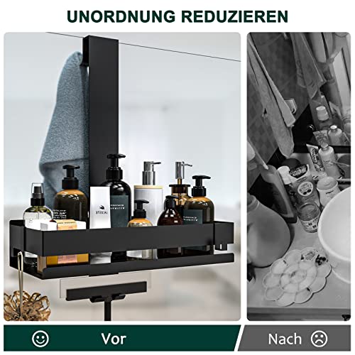 - تصميم عملي 2 في 1: صينية دش للحمام مع خطافين عمليين. على الخطافين يمكنك تعليقها على سبيل المثال ممسحة استحمام أو إسفنجة استحمام على رف الدش. يمكن وضع المناشف على الجانب الآخر. رف دش معلق مصنوع من تصميم فتحة تصريف مجوفة يمنع الماء من البقاء على الرف، جيد التهوية وجاف وسهل التنظيف.