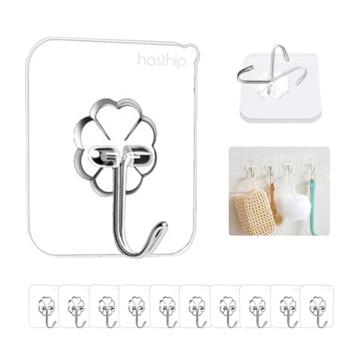 HASTHIP - خطافات حائط للتعليق دون تثقيب، شماعات قوية لاصقة مقاومة للماء لتعليق الأرواب والجواكت والفوط والمفاتيح والشنط والمصابيح والتقويمات - شفافة، من هاسشيب عبوة من 10 قطع