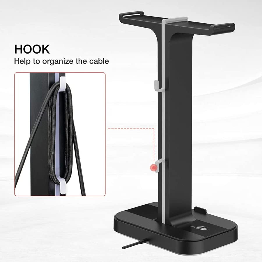 - 【ليس فقط لسماعات الرأس】تم تصميم قاعدة حامل السماعات مع شريحة صغيرة لحمل الموبايل وجانب الحامل مزود بخطافات لتنظيم الكابلات ومنع تشابك الأسلاك والكابلات بشكل فوضوي.