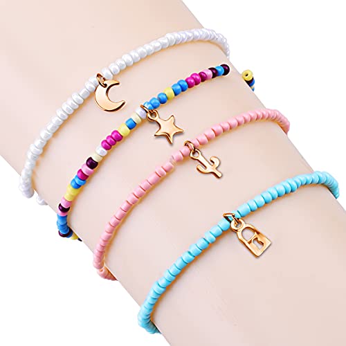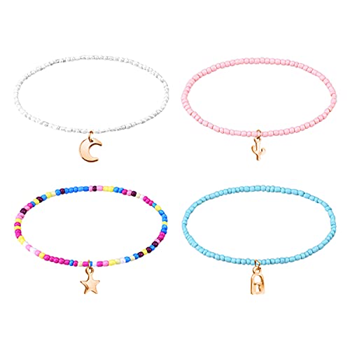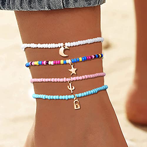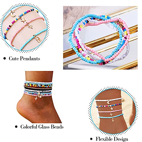 HB-Int - اساور كاحل متعددة الطبقات من اتش بي-انت 7 قطع خلخال بوهو متعدد و4 بدلاية على شكل قمر ونجوم ملونة للنساء والبنات