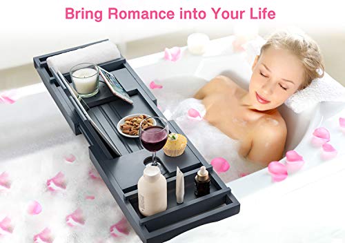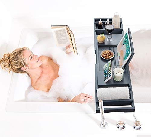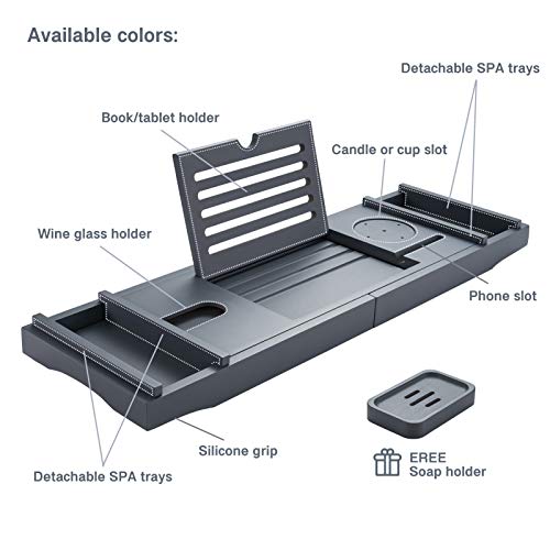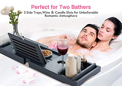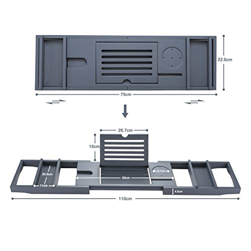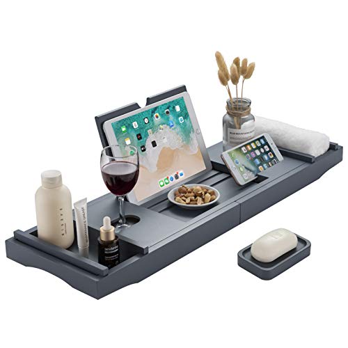 hblife - صينية حوض الاستحمام من اتش بي لايف [متينة وغير قابلة للانزلاق]، صينية حمام قابلة للتمدد لشخص أو شخصين، جوانب ممتدة تناسب أي حوض أو حامل للموبايل والاي باد والكؤوس، حامل صابون مجاني - رمادي