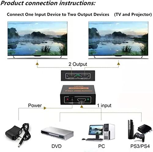 - 【موزع HDMI 1 في 2 خارج】: - يمكن استخدام موزع HDMI هذا لتوزيع إشارة إدخال HDMI واحدة إلى منفذي HDMI، ونقل الفيديو والصوت في وقت واحد، بدون خسارة أو تأخير. يمكنك توصيل مصدر HDMI واحد للتبديل بين شاشتين، فهو يدعم شاشتين نشطتين في نفس الوقت.
