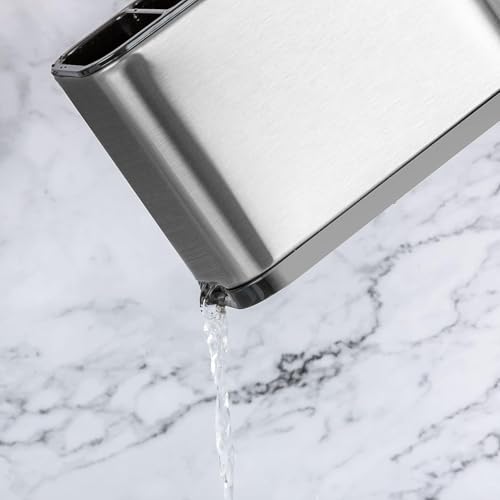 - تصميم متين من الفولاذ المقاوم للصدأ: مصنوع من الفولاذ المقاوم للصدأ الفاخر، ويضمن منظم أدوات المطبخ المتانة وطول العمر. يعمل كحامل معالق وسكاكين موثوق به للمطبخ، مما يحافظ على مظهره الأنيق حتى مع الاستخدام اليومي، ويعزز وظائف مطبخك.