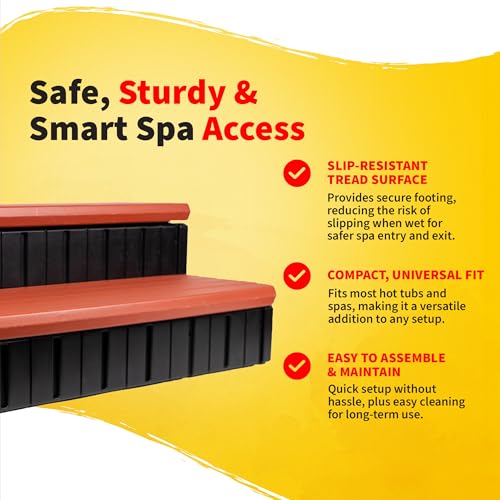 - تصميم متين ومقاوم للانزلاق - تم تصميم سلالم تخزين المنتجعات الصحية هذه مع وضع السلامة في الاعتبار، وتتميز بمداس محكم ومقاوم للانزلاق من أجل أقدام آمنة، مما يجعل دخول حوض الاستحمام الساخن الخارجي أو الخروج منه أسهل وأكثر أمانًا حتى عندما يكون رطبًا.