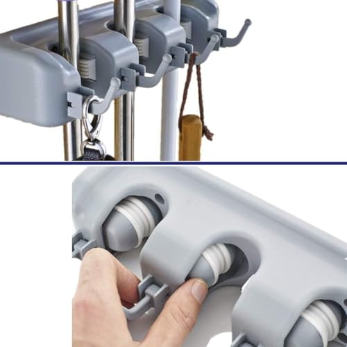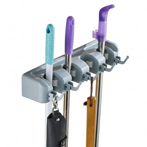 Generic - حامل مكانس ومماسح حائط 5×1 شديد التحمل – منظم أدوات تنظيف بـ 4 فتحات و5 خطافات غير قابل للانزلاق – شماعة تخزين للمطبخ والحمام والحديقة