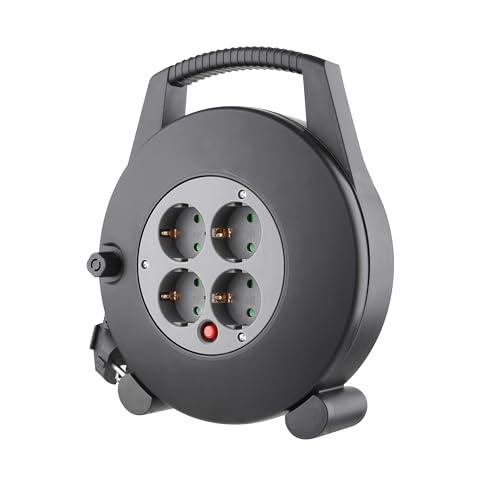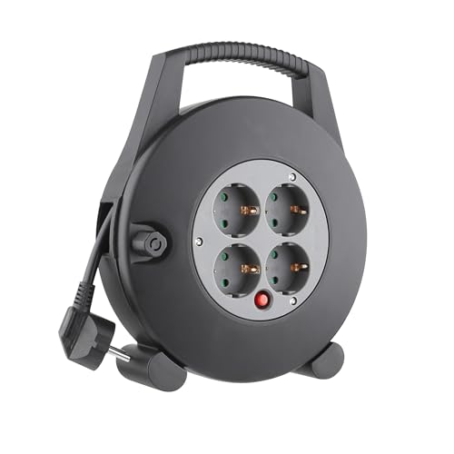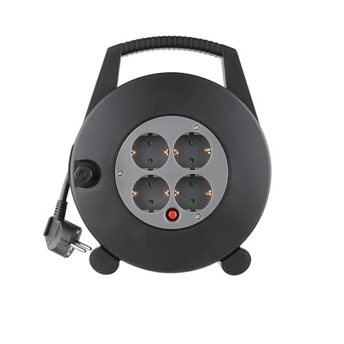 ENERGY ELHADAD - وصلة بكرة كيبل شديدة التحمل (كيبل بطول 10 متر) مع 4 منافذ طاقة ومفتاح تشغيل/ايقاف مدمج، تصميم محمول مع مقبض، ادارة طاقة عالية الامان للاستخدام في المنزل وورشة العمل - انيرجي الحداد