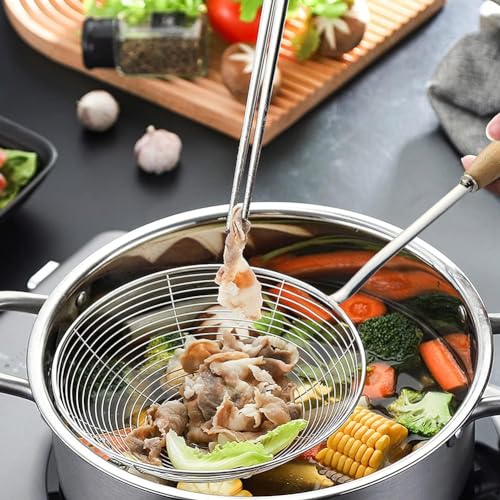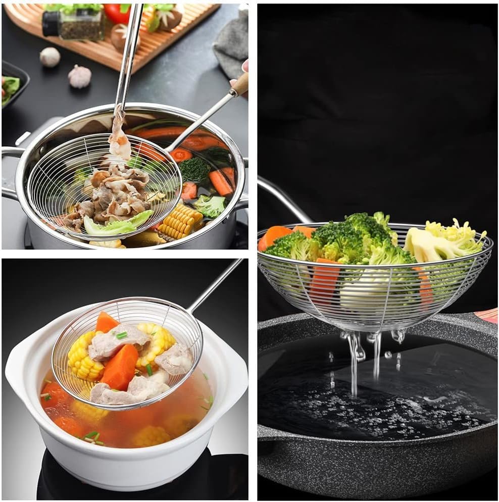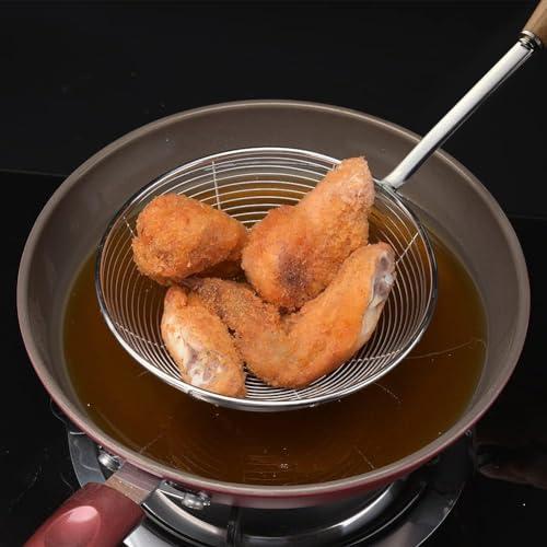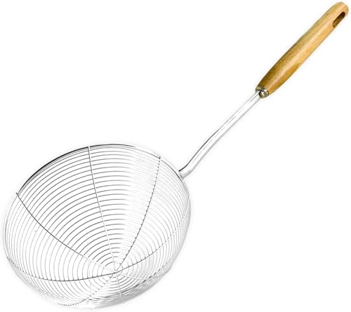 Generic - ملعقة قلي متينة من الستانلس ستيل بمقبض خشبي - مصفاة شبكية مقاومة للصدا للفلافل والبطاطس والوجبات الخفيفة والقلي العميق - امنة للحرارة ومتينة لتصريف الزيت في المطبخ